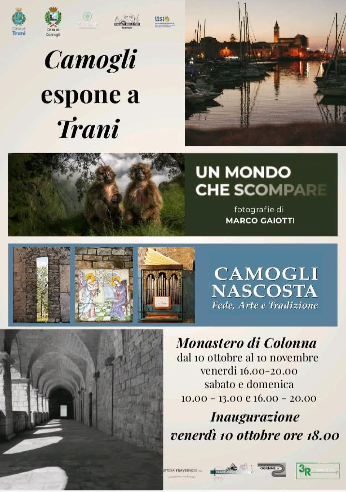 Oltre alla mostra di Gaiotti, il Monastero di Colonna ospiterà i “totem” di “Camogli nascosta – Fede, Arte e Tradizione”, esposizione diffusa presentata lo scorso 18 settembre. La terza mostra, proposta dall’assessora Gambazza e condivisa dalla giunta comunale di Trani, prevede l’installazione di pannelli fotografici in luoghi simbolici del patrimonio artistico-culturale cittadino, tra cui Palazzo Comunale, Biblioteca Giovanni Bovio e Palazzo Beltrani.